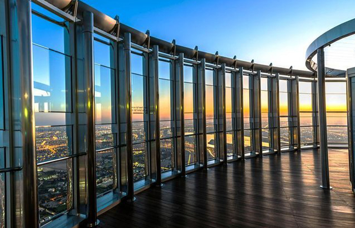 This experience is unforgettable. You will witness a modern architectural masterpiece and enjoy a panoramic view through the glass walls while you go up to the top of the tower on an elevator whose speed is 10 meters per second. The view will be amazing, whether you choose the 124th floor or the 148th floor.